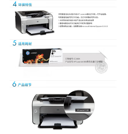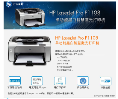 參數(shù) [商品名稱] 惠普(HP)P1108 [最大支持幅面] A4 [打印速度] 18頁/分 [品牌] 惠普(HP) [型號] P1108